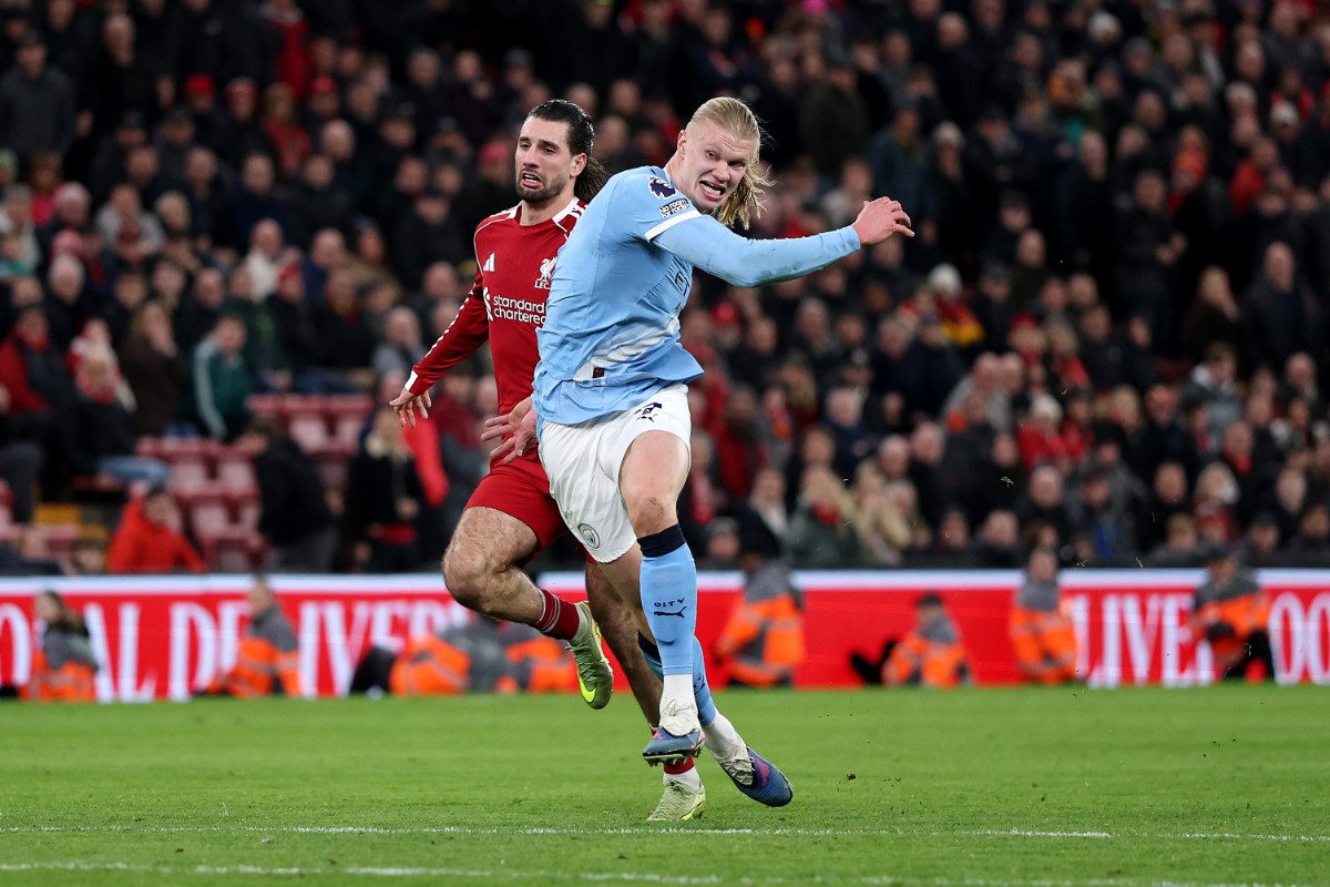 A high ball in midfield was won by Bernardo Silva. The Manchester City captain flicked the ball to Rayan Cherki. With Alisson stranded behind him, Cherki knew that the Liverpool goal was unguarded. The French international hit a dribbling strike that slowly rolled towards the goal. Cherki’s strike wasn’t powerful, to say the least. The ball was meandering its way into the net. As the ball rolled towards the net, Erling Haaland took off like a freight train in an attempt to tap the ball into an empty net. All that was in Haaland’s way was make shift Liverpool right-back Dominik Szoboszlai. As Haaland went to sprint past Szoboszlai, the Hungarian international pulled Haaland back. In response, Haaland pulled Szoboszlai back as the ball rolled into the net. Referee Craig Pawson awarded a goal and the Manchester City fans, staff and players celebrated jubilantly.